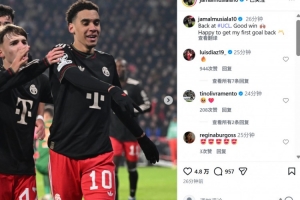 本场比赛穆西亚拉破门,赛后他也在个人社媒晒出本场照片,配文写道:“回到欧冠取得很棒的胜利,很高兴能够收获回归以来的首粒进球。”