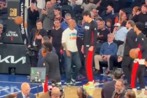 开拓者今日客战尼克斯,杨瀚森赛前热身看到了场边的马布里,上前问候,两人大笑着沟通,聊了许久。