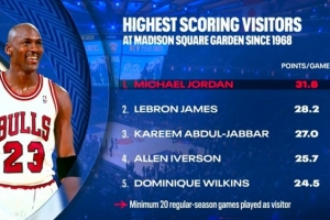 湖人客场挑战尼克斯,转播方给出麦迪逊客场球员场均得分榜(至少打20场):