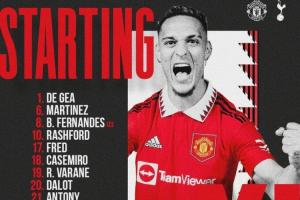 曼联首发:1-德赫亚、23-卢克肖、6-利桑德罗-马丁内斯、19-瓦拉内、20-达洛特、18-卡塞米罗、8-B费、17-弗雷德、21-安东尼、10-拉什福德、25-桑乔