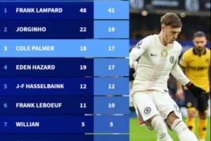 体育资讯2月8日讯 在本轮英超切尔西3-1击败狼队的比赛中,帕尔默点射双响,德转也盘点了切尔西球员在英超点球进球榜,帕尔默第三,具体如下: