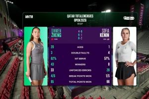 体育资讯02月09日讯 WTA1000多哈站女单首轮比赛,时隔4个月复出的郑钦文三盘击败前澳网女单冠军肯宁,晋级第二轮。