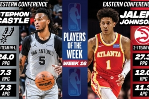 体育资讯2月10日讯 今日NBA官方宣布,马刺后卫斯蒂芬·卡斯尔和老鹰前锋杰伦·约翰逊分别被评本赛季第16周西部和东部周最佳球员。
