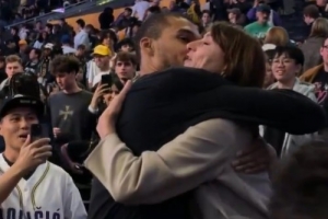 赛后,文班亚马和场边观战的母亲拥抱。