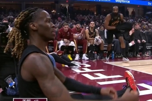 GIF——基翁·埃利斯倒地 哈登从替补席上冲上去拉起队友