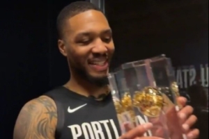 赛后,利拉德在后台和字母哥分享自己的奖杯,字母哥说道:“只有其他两名球员赢得过三次三分大赛冠军。”