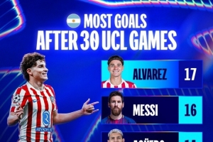 体育资讯11月12日讯 欧冠官方统计了阿根廷球员前30场欧冠比赛的进球数量,并列出榜单,阿尔瓦雷斯17球居首,梅西16球次席。