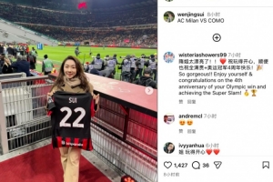 体育资讯2月19日讯 今日,花滑名将隋文静在个人社媒晒出自己现身圣西罗球场,观战意甲第24轮AC米兰vs科莫的比赛。她还拿着一件印有自己姓名的米兰22号球衣。