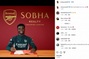 萨卡也通过社媒晒出自己的签字照,并配文:“完全忠于阿森纳🔒❤️”。