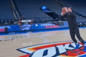 GIF-东契奇踩着中场LOGO三分三连中