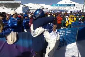 体育资讯02月22日讯 女子U型场地技巧决赛,谷爱凌第二轮得到94分,暂时位列第一,谷爱凌完成第二滑后到场边与母亲拥抱。