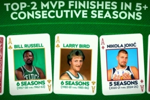 约基奇:20-21赛季至24-25赛季(连续5个赛季)