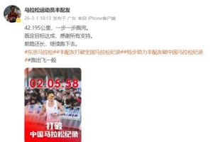 体育资讯3月2日讯 北京时间3月1日,丰配友在东京马拉松比赛中以2小时05分58秒完赛,取得亚洲第一名,并且打破全国马拉松记录,带领中国进入205时代。赛后,丰配友在社媒分享自己的成绩并表示感谢,同时自勉将继续努力。