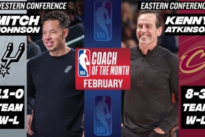 体育资讯3月4日讯 今天NBA官方公布了2月份月最佳教练,东部骑士主帅阿特金森、西部马刺主帅米奇·约翰逊当选。