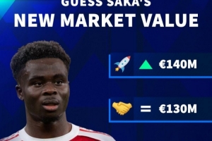 体育资讯3月4日讯 德国转会市场更新社媒动态,预热阿森纳边锋萨卡的身价变动。