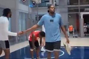 比赛打着打着,杜兰特嫌弃Speed上篮不中,直接脱下了球鞋选择退赛,他表示:“这个上篮我真是受不了了。等我有了更强的队友我会回来的。”