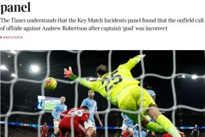 体育资讯11月14日讯 误判!泰晤士:专家组裁定,范戴克对曼城进球应判有效