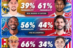 欧冠1/4决赛晋级概率: