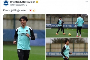 布莱顿社媒晒出三笘薫的照片,确认这位日本攻击手恢复训练,配文:“三笘薫距离复出更近了。”