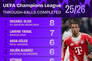 下一篇: 本赛季欧冠成功直塞传球榜:奥利塞8次居首,亚马尔7次第二
