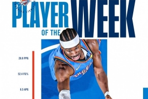 雷霆官方晒出亚历山大周最佳海报并写道:“亚历山大是上周的西部最佳球员!”
