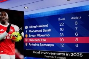 据BBC统计,埃泽今年英超参与18粒进球,仅少于哈兰德、萨拉赫、姆伯莫。
