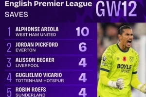 与此同时,西汉姆门将阿雷奥拉则单场完成10次扑救,帮助西汉姆战平伯恩茅斯。这也创下了本赛季英超门将的单场扑救纪录。