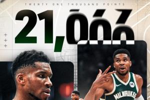 字母哥(30岁零358天)是NBA历史拿到21000分第六年轻的球员,前五是詹姆斯、张伯伦、科比、杜兰特和乔丹。