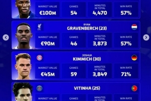 维蒂尼亚(巴黎,25岁,葡萄牙):身价9000万欧,68场,5373分钟,胜率78%