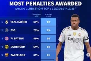 体育资讯12月4日讯 《转会市场》统计了2025年五大联赛俱乐部各项赛事获得点球情况,皇马位居榜首。