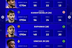体育资讯12月5日讯 《转会市场》评选2025年最佳左边锋,并列出了4人候选同时对比了他们的数据: