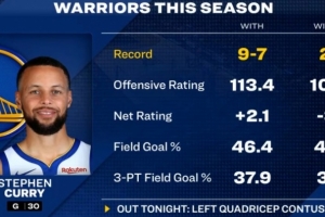 转播方给出一组数据,本赛季库里在场时勇士9胜7负,进攻效率113.4,净效率+2.1,投篮命中率46.4%,三分命中率37.9%;