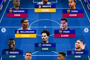 前锋:拉菲尼亚(巴萨)、姆巴佩(皇马)、亚马尔(巴萨)