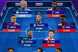前锋:维尔茨(利物浦,1.1亿欧元)、哈兰德(曼城,2亿欧元)、伊萨克(利物浦,1.2亿欧元)、萨卡(阿森纳,1.3亿欧元)