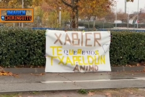 由于皇马近期战绩不佳,主帅阿隆索面临下课危机,有球迷在皇马基地外挂横幅支持阿隆索,横幅上面写着:“哈维(阿隆索),我们爱你,冠军,加油。”