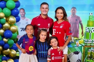 体育资讯12月11日讯 库蒂尼奥为儿子庆生,全家身穿他效力过的俱乐部的球衣。