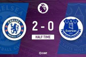 上半场伤停补时3分钟,半场结束,切尔西暂2-0埃弗顿。
