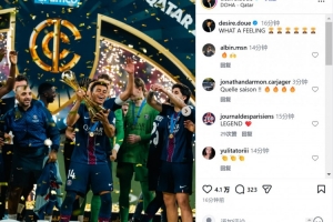 在社交媒体上,巴黎圣日耳曼边锋杜埃晒出捧杯照进行庆祝,他写道:多么美妙的感觉!