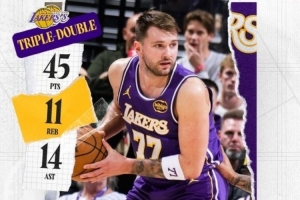赛后湖人发布东契奇数据海报,并写道:“湖人生涯的首个40+三双。”