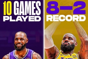 詹姆斯复出之后,湖人取得8胜2负的战绩,他个人的表现也逐渐提升。复出前五场比赛,詹姆斯场均出战32.3分钟拿到15.2分4.0篮板7.0助攻,三项命中率46/33/52%;后五场场均35.8分钟砍下22.0分7.8篮板7.6助攻,命中率50/37/82%。