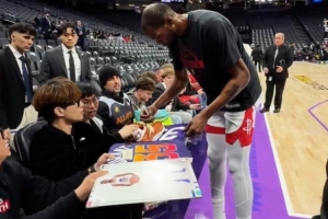 GIF——杜兰特赛前给中国球迷签名