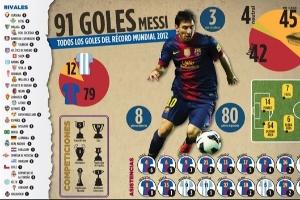 2012年12月22日,梅西在巴萨3-1巴拉多利德的比赛中破门,打进自己在2012年的第91球,以69场91球的数据超过盖德-穆勒6球,刷新足坛历史自然年进球纪录。在那年的比赛中,梅西还送出了24次助攻。