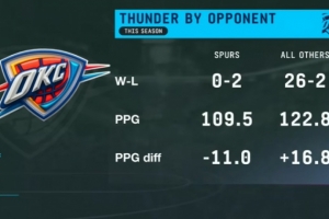 雷霆本赛季对阵马刺战绩0-2,场均仅109.5分,场均净负11分