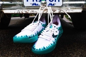 这双Converse BB Trilliant PE设计灵感来源于他的家乡俄勒冈州。俄勒冈州有“玫瑰之州”的昵称,州花就是玫瑰,呼应鞋垫元素,同时右脚鞋垫上还有他的个人Logo。而常绿针叶林,是俄勒冈州的代表性树种之一,也呼应鞋面的树纹图案。