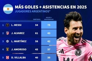 体育资讯1月6日讯 德国转会市场统计了阿根廷球员2025年俱乐部+国家队参与进球数量,并列出榜单,梅西参与75球断层居首。