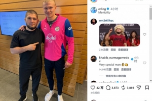 体育资讯1月7日讯 曼城前锋哈兰德更新社媒动态,晒出与UFC传奇选手小鹰(哈比卜·努尔马戈梅多夫)的合照。