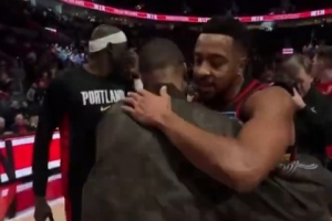 赛后,此役重回波特兰的麦科勒姆与老队友利拉德相拥致意。