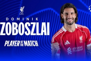 此役索博斯洛伊为利物浦踢满全场,任意球直接破门,当选欧冠官方本场比赛最佳球员。