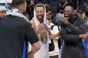 库里、追梦赛后与克莱场边聚首,三人看起来都非常开心。