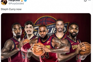 湖人自媒体𝐏𝐮𝐫𝐩𝑮𝒐𝒍𝒅 🏆晒出了詹姆斯当年率领的骑士五人组(詹姆斯、JR·史密斯、奥斯曼、乔治·希尔、TT)并评论道:“这就是库里现状。”